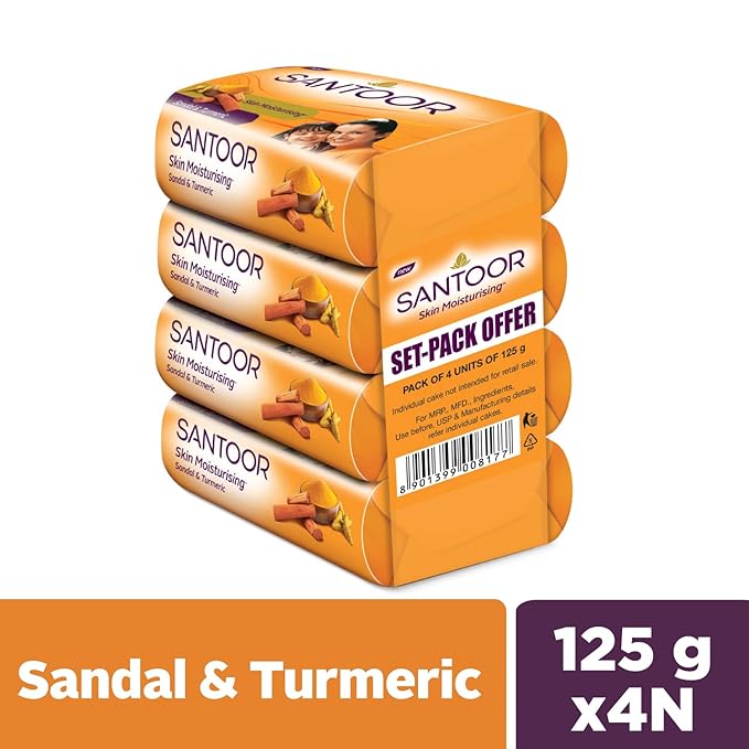 Santoor Sandal & Turmeric Soap 4 Bars (100g) combines the time-tested ingredients of sandalwood and turmeric to provide deep cleansing and skin rejuvenation. Known for their antibacterial and healing properties, these natural ingredients help even skin tone and enhance your natural glow. With a rich, creamy lather and gentle fragrance, it’s ideal for daily use for healthy, radiant skin.