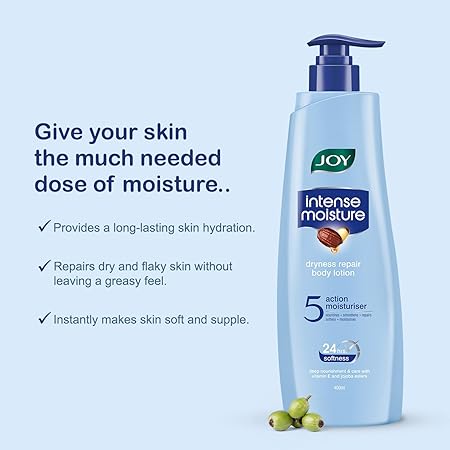 Joy Intense Moisture Dryness Repair Body Lotion (400ml) is for external use only. Avoid contact with eyes. In case of contact, rinse immediately with plenty of water. Do not apply to broken or irritated skin. If irritation occurs, discontinue use and consult a healthcare professional. Perform a patch test before use to ensure compatibility with your skin type. Store in a cool, dry place, away from direct sunlight. Keep out of reach of children. Always read the label before use.