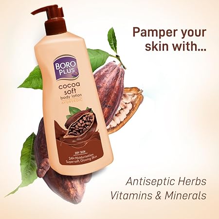 BoroPlus Cocoa Soft Ayurvedic Body Lotion (400ml) is a rich, indulgent moisturizer formulated to provide deep hydration and nourishment to dry skin. Enriched with natural ingredients like Cocoa Butter, Almond Oil, and Milk Cream, this lotion penetrates up to 20 layers deep, ensuring long-lasting moisture and softness. Its unique Ayurvedic formulation helps combat signs of dryness, leaving your skin feeling super soft, smooth, and glowing. Suitable for all skin types, this non-greasy lotion absorbs quickly, making it ideal for daily use