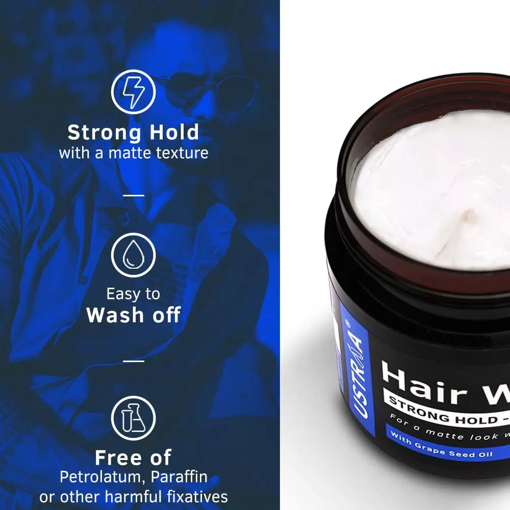 Ustraa Hair Wax – Matte Look with Grape Seed Oil (50g) is a premium styling product designed to provide a strong hold with a natural matte finish. Formulated with Brazilian Palm Wax, Clay, and Grape Seed Oil, this hair wax is ideal for short to medium-length hair, offering excellent texture and control without the greasy shine. The non-sticky, non-greasy formula ensures that your hairstyle stays intact throughout the day, and it washes off easily without the need for shampoo. Free from harmful chemicals like Petrolatum and Paraffin, it is a safe choice for daily use.