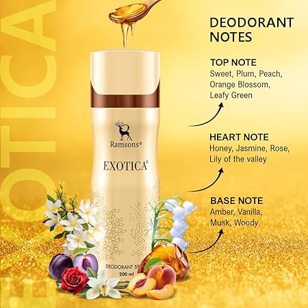 The Ramsons Exotica Deodorant Spray 200ml is a captivating fragrance designed to keep you feeling fresh and confident throughout the day. Crafted with a blend of floral, fruity, and woody notes, this deodorant offers a long-lasting scent suitable for both men and women.? Fragrance Profile: Top Notes: Plum, Peach, Orange Blossom, Leafy Green Heart Notes: Honey, Jasmine, Rose, Lily of the Valley Base Notes: Amber, Vanilla, Musk, Woody? Amazon India +3 Meesho +3 Amazon India +3 This unique combination provides a refreshing and alluring aroma that lingers throughout the day, keeping body odor at bay.? Key Features: Long-Lasting Freshness: Offers enduring fragrance to keep you fresh all day. Unisex Appeal: Designed to be suitable for both men and women. Affordable Luxury: Provides a premium scent experience at an accessible price point. Versatile Use: Ideal for daily wear, office use, or casual outings.? Amazon India +1 Desertcart Bangladesh +1 tarakonline.com +1 Amazon India +1 Whether you're heading to work, a casual meet-up, or simply want to enjoy a refreshing scent, the Ramsons Exotica Deodorant Spray is your perfect companion.