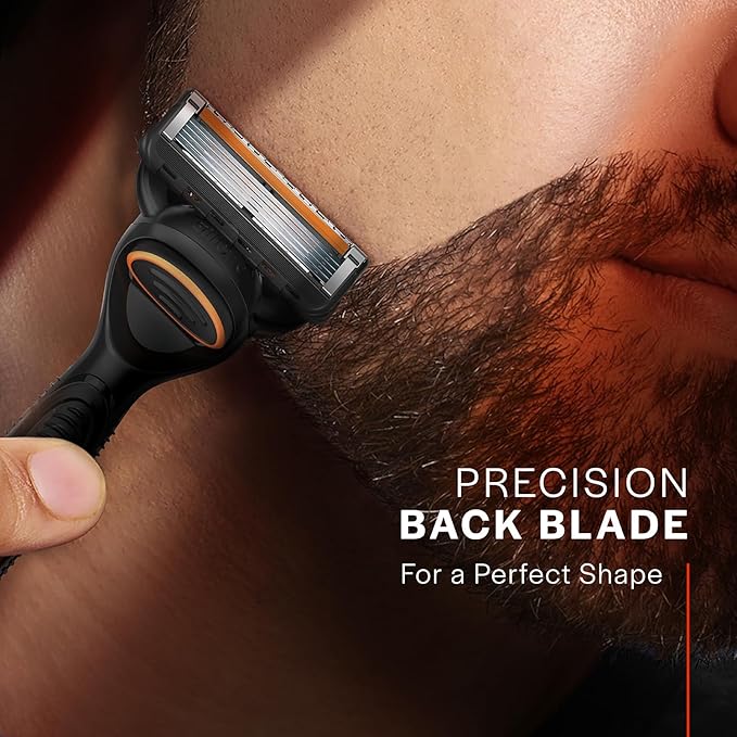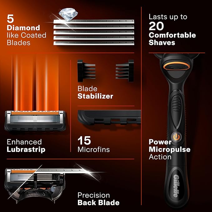 The Gillette Fusion5 Power Razor combines advanced shaving technology with ergonomic design to deliver a superior shaving experience. Equipped with five anti-friction blades, it provides a close and comfortable shave with each stroke. The precision trimmer on the back is ideal for styling facial hair and reaching difficult areas like under the nose. Additionally, the razor features a lubrication strip that fades when it's time to replace the blade, ensuring optimal performance. The ergonomic handle offers excellent control, and the battery-powered micropulses help reduce friction, allowing the razor to glide smoothly over the skin