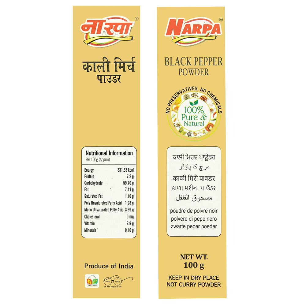 Narpa Black Pepper Powder is made from premium-quality peppercorns, finely ground for a bold, spicy, and aromatic flavor. Perfect for soups, salads, curries, and marinades, it enhances every dish with its rich taste. Hygienically processed to retain natural oils and freshness, with no artificial colors, preservatives, or additives. A must-have spice for cooking and home remedies. Order now to add pure, authentic flavor to your meals!