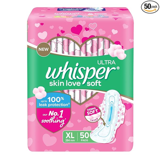 Feel the care your skin deserves with Whisper Ultra Skin Love Soft. Designed with a soft top sheet infused with skin-loving ingredients, these XL pads offer maximum comfort and protection throughout your period. With 50 pads in a pack, you're always prepared. Ultra-soft top sheet for a gentle feel XL size for long-lasting coverage Locks up to 100% wetness & odor Dermatologically tested and gentle on skin Stay fresh, dry, and loved – all day long.