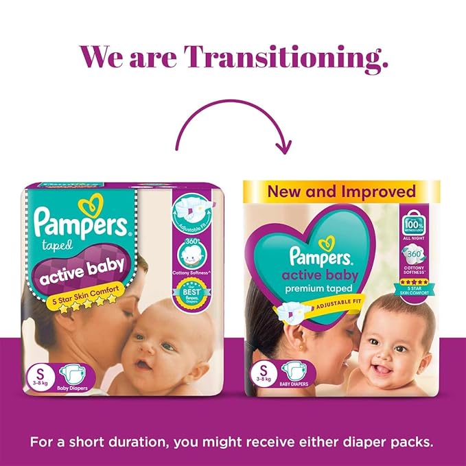 Pampers Active Premium Taped Diapers in size "S" offer superior comfort and protection for your baby. Designed for babies weighing up to 8 kg, these diapers feature a soft cotton-like top layer, breathable materials, and a 3-way fit for all-around leakage protection. The wetness indicator changes color to let you know when it's time for a change. Each pack contains 22 diapers, perfect for keeping your baby dry and comfortable throughout the day and night.