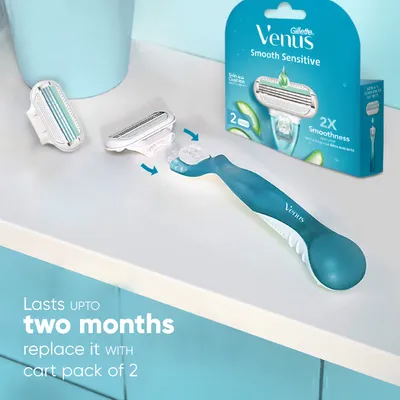 Specially designed for sensitive skin, Gillette Venus Smooth Sensitive offers a gentle yet effective shave. This pack includes 2 razors with 3 sharp blades and a SkinElixir™ lubrication strip enriched with Aloe Vera for enhanced glide and reduced irritation. The ergonomic handle provides a secure grip, while the pivoting head effortlessly follows your body's curves for a smooth, close shave with comfort and care.