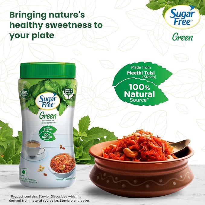 Enjoy the natural sweetness without the calories with Sugar Free Green. Made from the goodness of stevia, a plant-derived sweetener, it provides a healthier alternative to regular sugar. Perfect for those managing their calorie intake, diabetics, or anyone aiming for a healthier lifestyle, Sugar Free Green delivers the same delicious taste without compromising on health. Ideal for sweetening beverages, desserts, and everyday recipes, the 200g pack ensures you always have a guilt-free sweetener on hand.