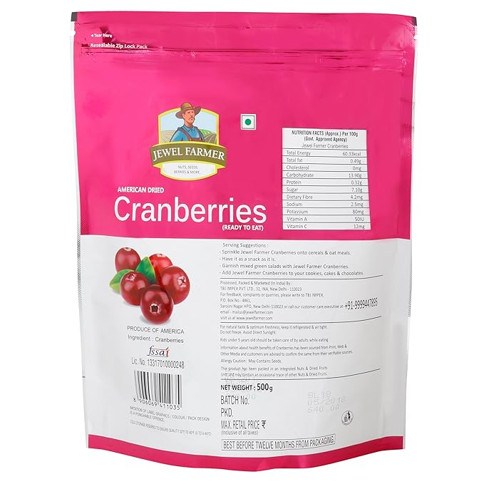 Store in a cool, dry place to maintain freshness. Contains cranberries; may not be suitable for individuals with berry allergies. Keep out of reach of children to avoid choking hazards. For best freshness, consume within the recommended time mentioned on the packaging. May contain traces of other allergens. Always check the packaging for specific ingredient details. Due to the natural sugar content, consume in moderation.