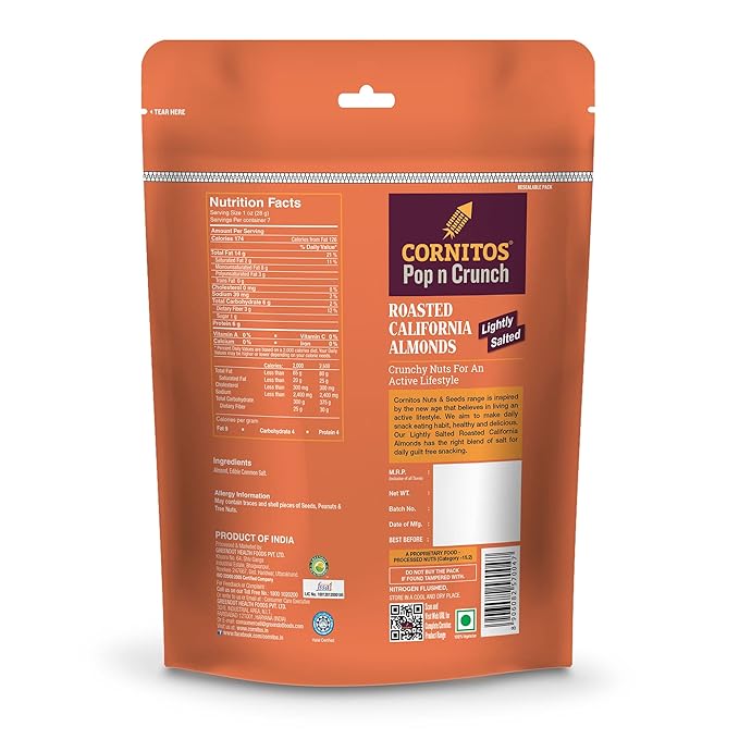 Cornitos Roasted California Almonds Lightly Salted are a premium snack crafted from the finest California almonds, roasted to perfection and lightly seasoned with salt. These almonds offer a delightful crunch and a rich, nutty flavor, making them an ideal choice for health-conscious individuals seeking a nutritious snack.