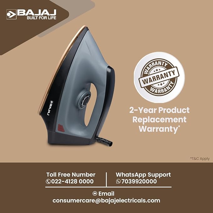 Product features, specifications, and design of the Bajaj Herculo 1100W Dry Iron are subject to change without prior notice. Images are for representation purposes only and may vary slightly from the actual product. Please follow the user manual instructions carefully for safe and optimal use. Bajaj is not responsible for any damage caused by improper handling or misuse.