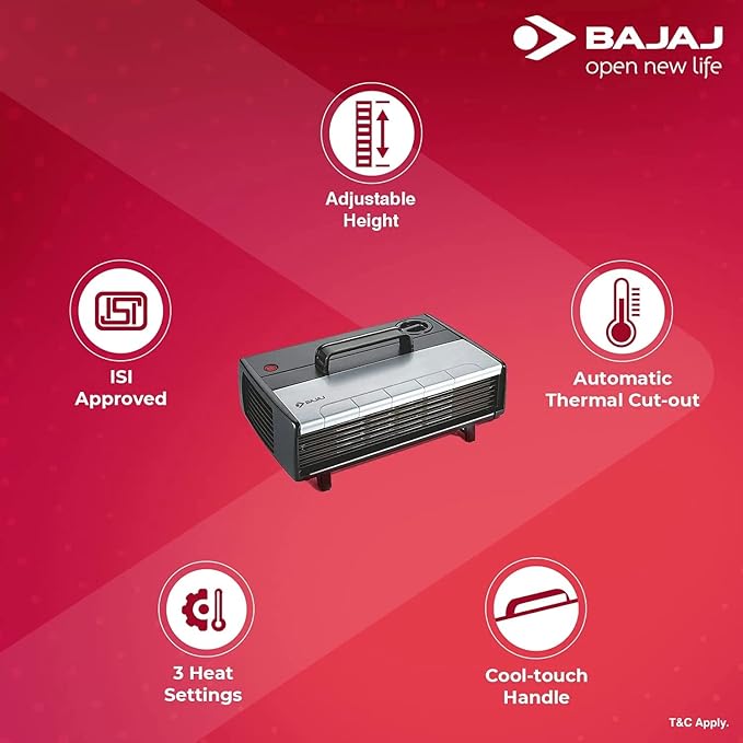 This appliance is intended for indoor domestic use only. Avoid covering the heater or placing it near flammable materials. Keep away from children and pets during operation. Always follow the manufacturer’s safety guidelines and user manual. Bajaj is not responsible for damage or injury caused by improper use or unauthorized repairs.