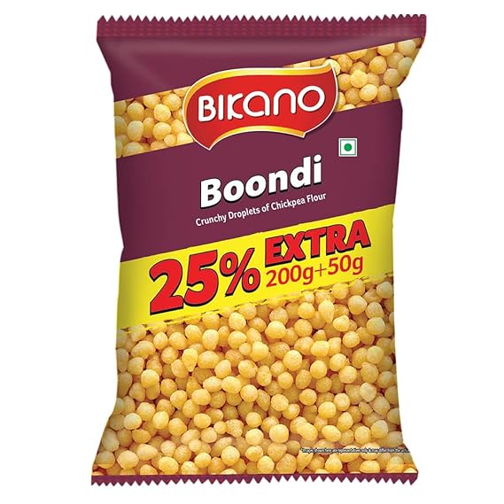 BIKANO Boondi Plain 200G is a classic Indian snack made from fine chickpea (besan) flour, deep-fried into small, round, crispy balls. These mildly salted boondi pearls are perfect as a standalone snack, a crunchy topping for raitas and chaats, or as an ingredient in traditional dishes like boondi curry.