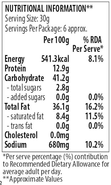 Contains nuts and may contain traces of gluten, soy, and dairy. Manufactured in a facility that also processes other allergens. Store in a cool, dry place away from sunlight. Once opened, transfer to an airtight container for best taste and texture. Always refer to the packaging for the most up-to-date ingredients and allergen information.