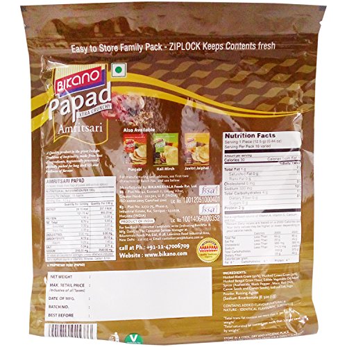 BIKANO Papad Amritsari 200G is a traditional North Indian-style crispy snack made from seasoned lentil flour. With a bold blend of spices inspired by Amritsari flavors, these papads offer a crunchy and flavorful accompaniment to meals or can be enjoyed as a standalone snack. Ideal for roasting, frying, or microwave preparation.