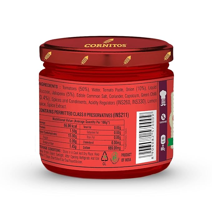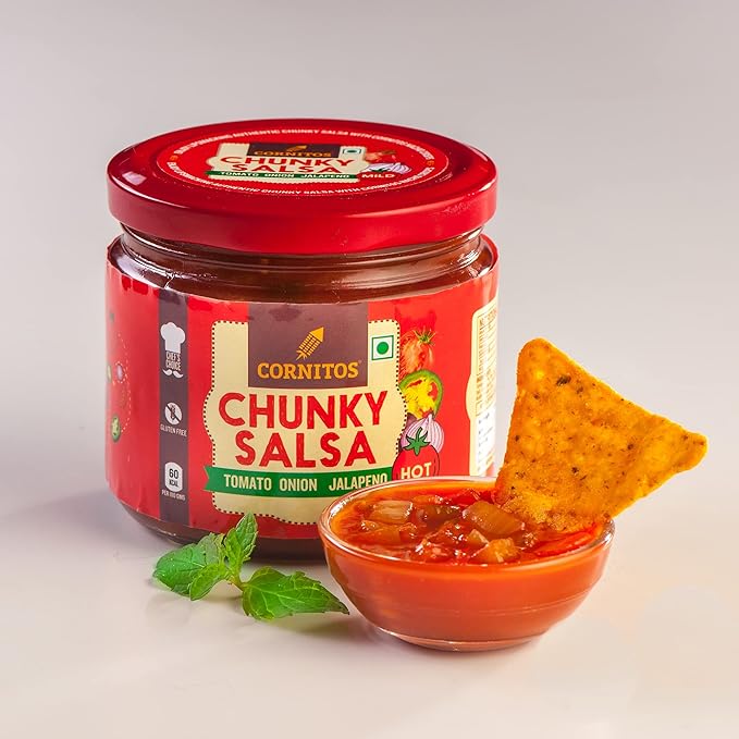Cornitos Chunky Salsa To Mild 330g is a classic tomato-based salsa made with juicy tomatoes, onions, jalapeños, and a blend of herbs and spices. Its mild heat level makes it perfect for all palates. Ideal for dipping with nachos, chips, or as a topping for tacos, wraps, and more. Weight: 330 grams Heat level: Mild Chunky texture with visible tomato and vegetable bits Vegetarian and gluten-free