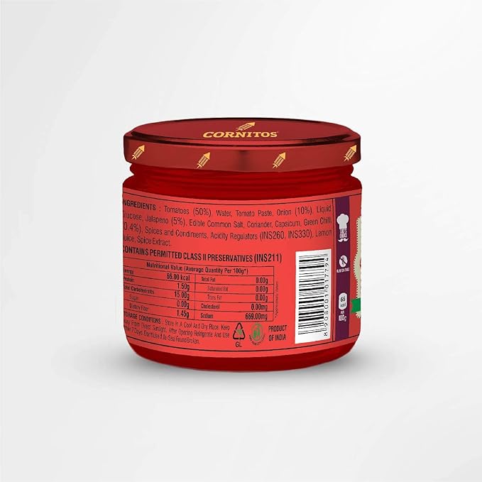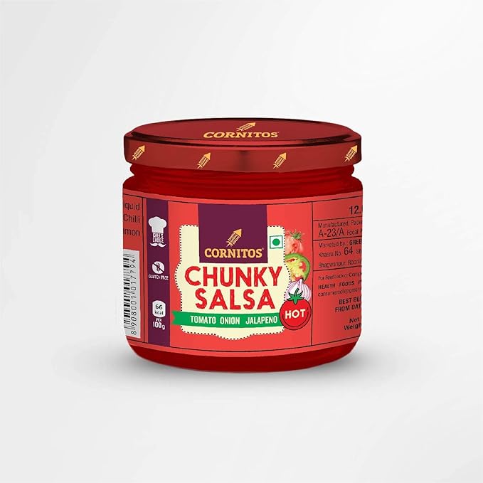 Cornitos Chunky Salsa TOJ Hot 330g is a bold and fiery tomato-based salsa made with ripe tomatoes, hot jalapeños, onions, and a spicy blend of herbs. Its thick and chunky consistency makes it a perfect dip or topping for those who enjoy a kick of heat in their snacks. Weight: 330 grams Heat level: Hot Chunky texture with visible veggie bits 100% vegetarian and gluten-free Great with nachos, tacos, wraps, and more