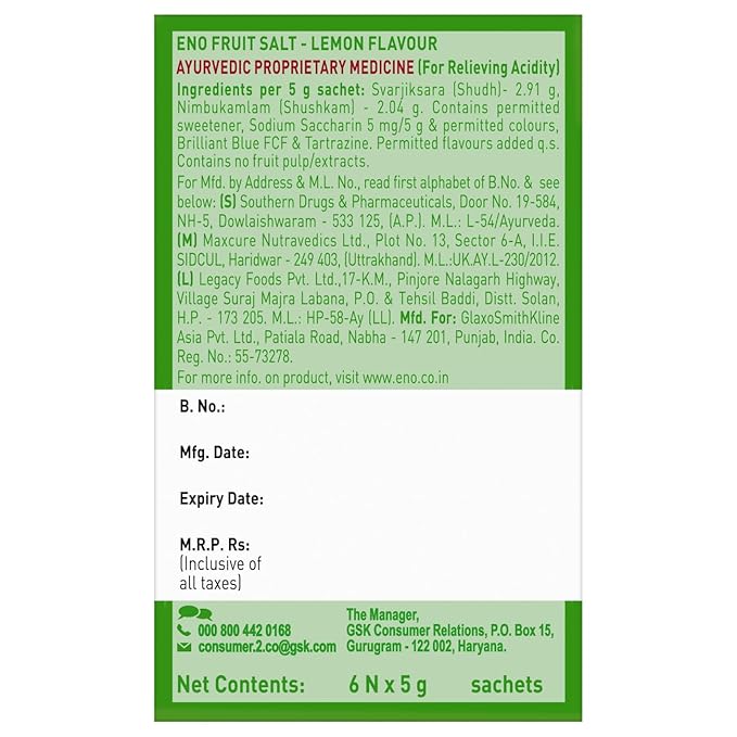 GSK Eno Family Pack 6S contains six sachets of fast-acting antacid powder that provides quick relief from acidity, heartburn, and indigestion. Eno begins to work in just 6 seconds by neutralizing excess stomach acid. This multi-sachet family pack is convenient for home use and travel, ensuring relief is always within reach.