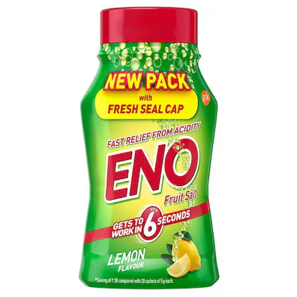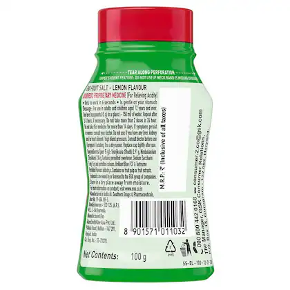 GSK Eno Fruit Salt Lemon Flavor 100g is a fast-acting antacid that provides quick relief from acidity, heartburn, and indigestion. Its refreshing lemon flavor makes it easy to consume, and it starts working within 6 seconds by neutralizing excess stomach acid. Ideal for adults needing immediate comfort after meals or spicy food.