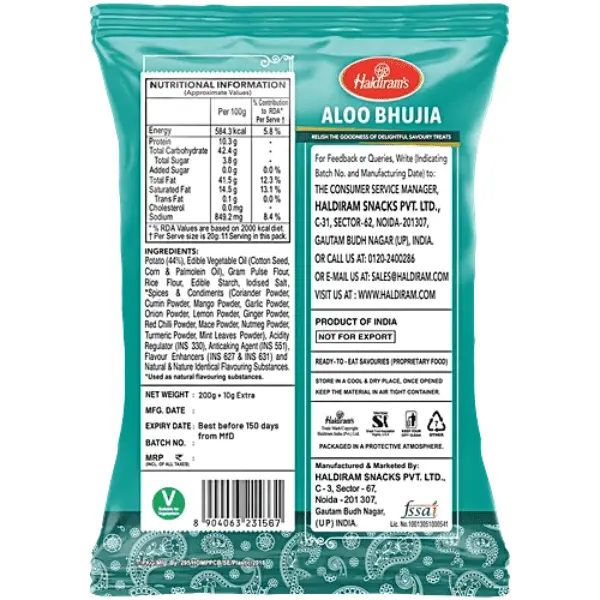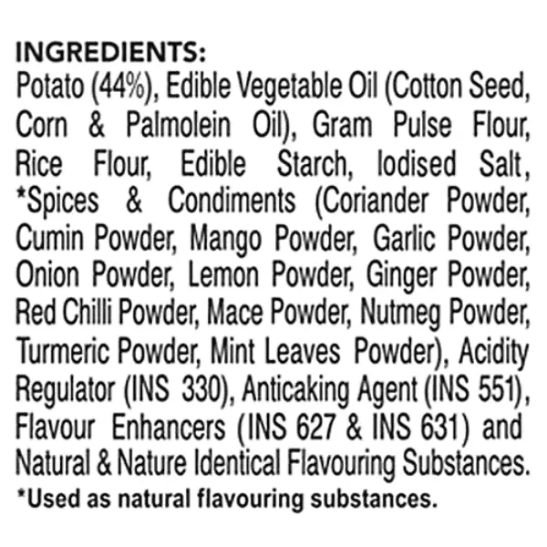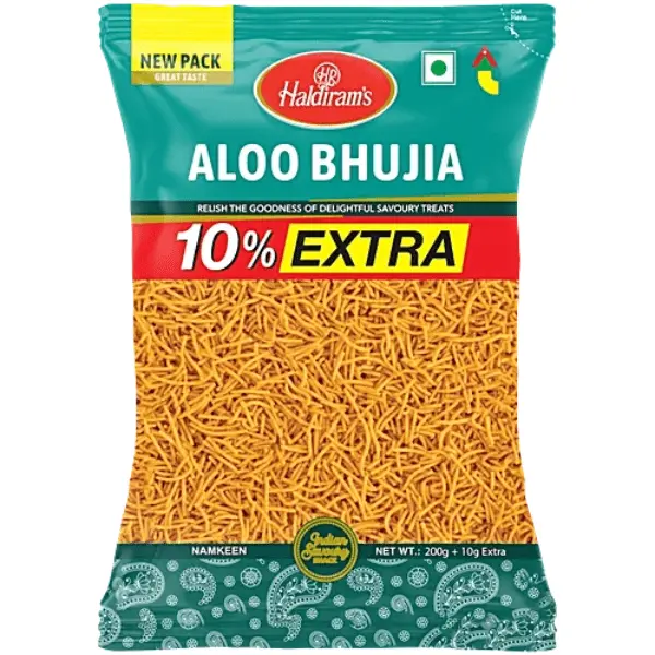 Haldiram's Aloo Bhujia is a crispy and spicy snack made from a flavorful mix of mashed potatoes, chickpea flour, and traditional Indian spices. This savory treat is perfect for tea-time munching, garnishing chaats, or enjoying as a standalone snack. Loved for its crunchy texture and bold taste.