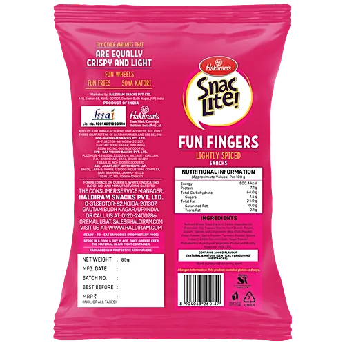Haldiram’s Snac Lite Fun Fingers 85G offers a light, crispy, and delightful snacking experience. Made with quality ingredients, these finger-shaped treats are seasoned to perfection for a mildly spiced, crunchy bite. Perfect for guilt-free snacking at work, school, or while relaxing at home.