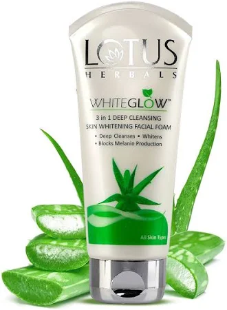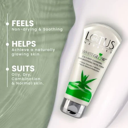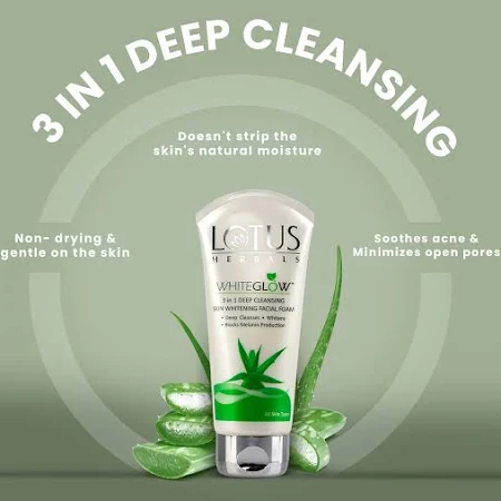 Lotus Herbals WhiteGlow 3-in-1 Deep Cleansing Facial Foam is a skin-brightening face wash that combines the benefits of cleansing, exfoliation, and brightening. Enriched with milk enzymes, aloe vera, and minerals, it removes dirt, oil, and makeup while helping lighten skin tone and refine texture. Suitable for all skin types.