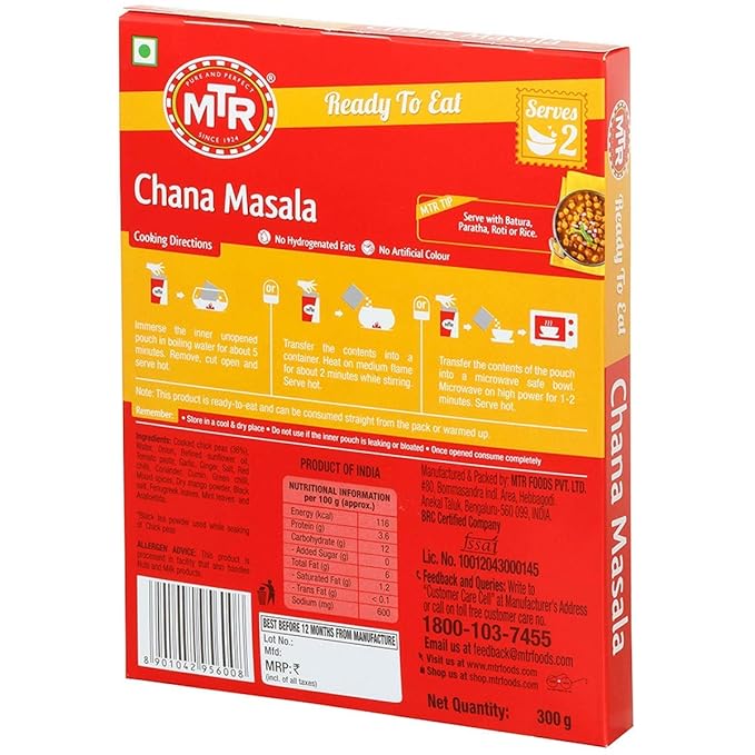 MTR Chana Masala 300g is a ready-to-eat North Indian delicacy made from chickpeas (chana) cooked in a rich, spiced tomato-onion gravy. Prepared with authentic Indian spices, this dish offers a delicious, wholesome meal that can be enjoyed anytime with rice, roti, or naan.