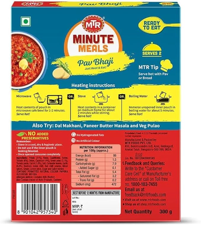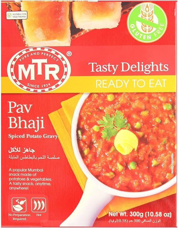 MTR Pav Bhaji 300g is a ready-to-eat version of the popular Mumbai street food made with mashed vegetables cooked in a rich, spiced tomato gravy. This flavorful bhaji is best enjoyed with butter-toasted pav (bread rolls) for a quick, satisfying meal anytime.