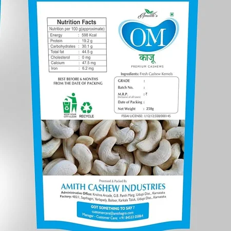 OM Cashew 250 g contains high-quality whole cashew nuts (Grade W-240), harvested from Ivory Coast and hygienically packed to preserve freshness . These premium cashews are naturally crunchy with a creamy, subtly sweet flavor and are gluten-free, making them a wholesome snack or versatile cooking ingredient. They’re nutrient-dense—rich in protein, heart-healthy fats, and essential minerals such as magnesium, copper, iron, zinc, and manganese .
