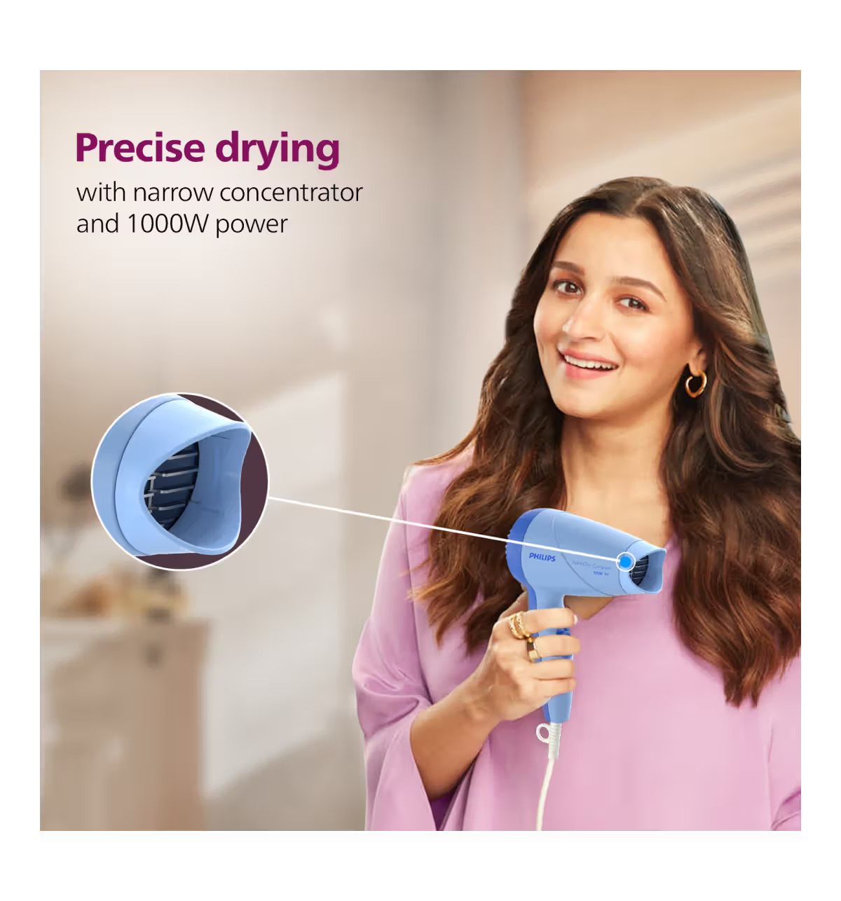 A compact yet powerful dryer delivering 1000 W of airflow, ideal for gentle and efficient everyday drying. It typically offers 2 speed/heat settings, a narrow concentrator nozzle for precision styling, a cool-air or ThermoProtect mode, a foldable handle (on travel models), and a 1.5 m cord with hanging loop for easy use and storage