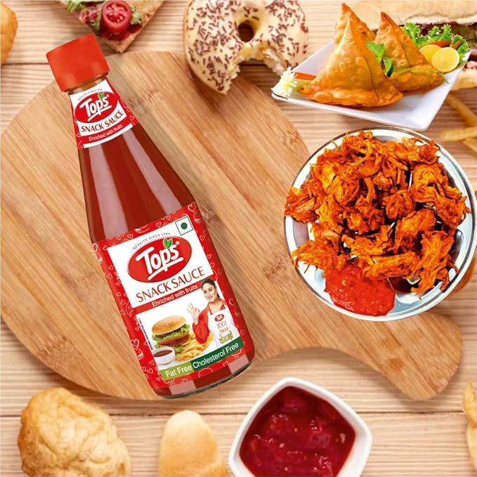 TOPS Snack Sauce is a rich, tangy tomato-based condiment crafted for enhancing a variety of snacks and meals. Made from “juicy hand-picked tomatoes,” it adds a spicy-tangy flavor that pairs perfectly with samosas, pakoras, fries, burgers, hot dogs, noodles, and more
