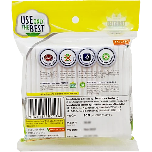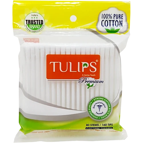 Tulips Cotton Buds Premium 80s are soft, hygienic, and made with 100% pure cotton tips and sturdy paper sticks. Designed for gentle cleaning, ear hygiene, makeup correction, and baby care, these buds offer a premium touch with extra softness and durability. Packed in a compact and travel-friendly container for convenience.