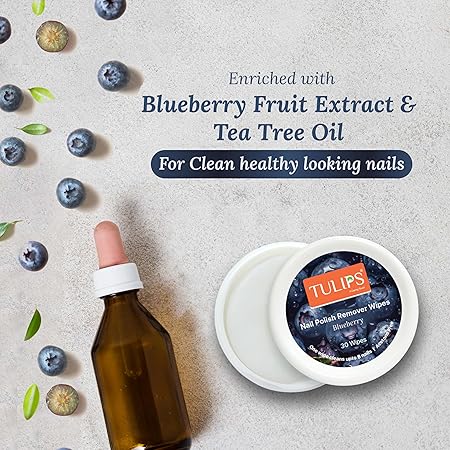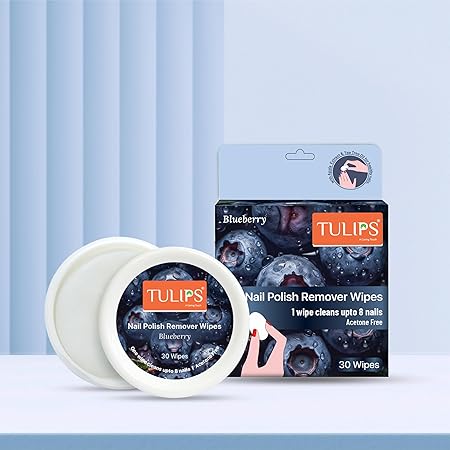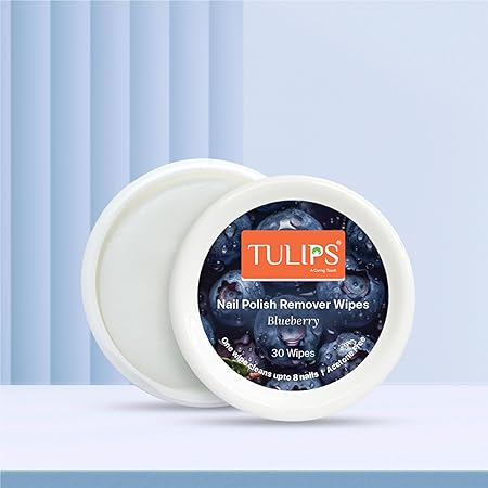 Tulips Nail Wipes Blueberry (1N) is a convenient, pre-moistened nail polish remover wipe enriched with the sweet fragrance of blueberries. It effectively removes nail polish while being gentle on nails and cuticles. The acetone-free formula helps retain natural moisture, making it ideal for regular use at home or on the go.