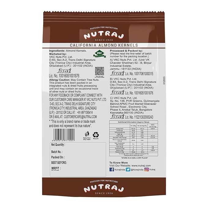 While this description reflects the core traits of Nutraj California Almond Kernels, actual packaging, labeling, nutritional values, or ingredient listings may vary by manufacturing batch or retailer. For accurate and current details—including allergen information (e.g. may contain traces of other nuts), nutritional facts, storage instructions, and best-before date—please refer directly to the physical product label.