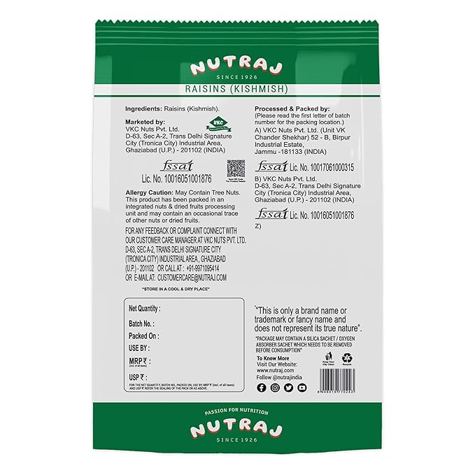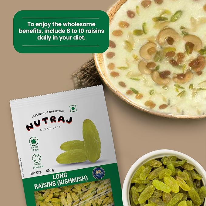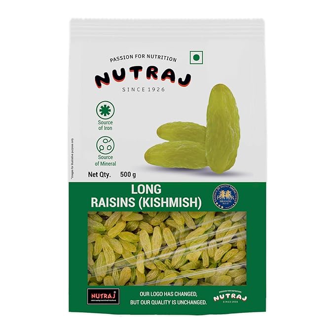 The information above reflects general characteristics of Nutraj Long Raisins 500 g. Actual product appearances, packaging design, nutritional facts, or formulations may vary based on batch, retailer, or region. Always refer to the physical product label for the most accurate information—inclusive of ingredients, allergen warnings (e.g., may contain traces of other tree nuts), storage instructions, expiry date, and health advisories.