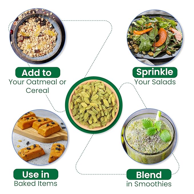 Elevate your snacking and cooking with Nutraj’s premium green kishmish—long, plump, and naturally sweet. Rich in fiber, antioxidants, iron, and vitamins, these soft, chewy treats add a nutritious punch to oatmeal, desserts, salads, or simply enjoyed on their own. Packaged in a handy resealable pouch to preserve freshness and produced by a trusted Indian brand.