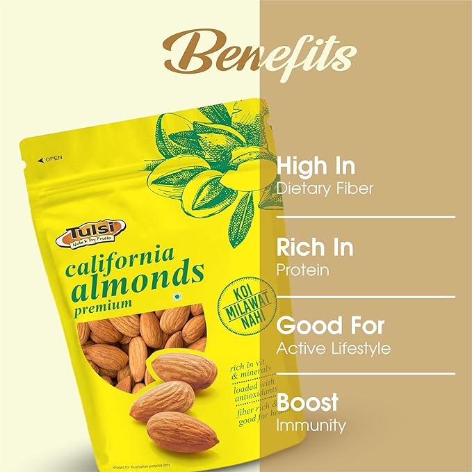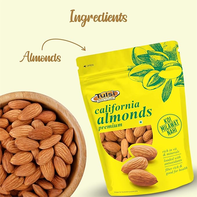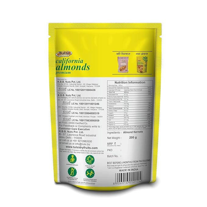 This description summarizes typical features of Tulsi California Almonds (200 g). Please note that actual product details—such as packaging, nutrition facts, ingredient lists, allergen notes (e.g., may contain traces of other nuts), or certifications—may vary by batch or retail. For the most accurate and up-to-date information, always refer to the physical product label before consuming.