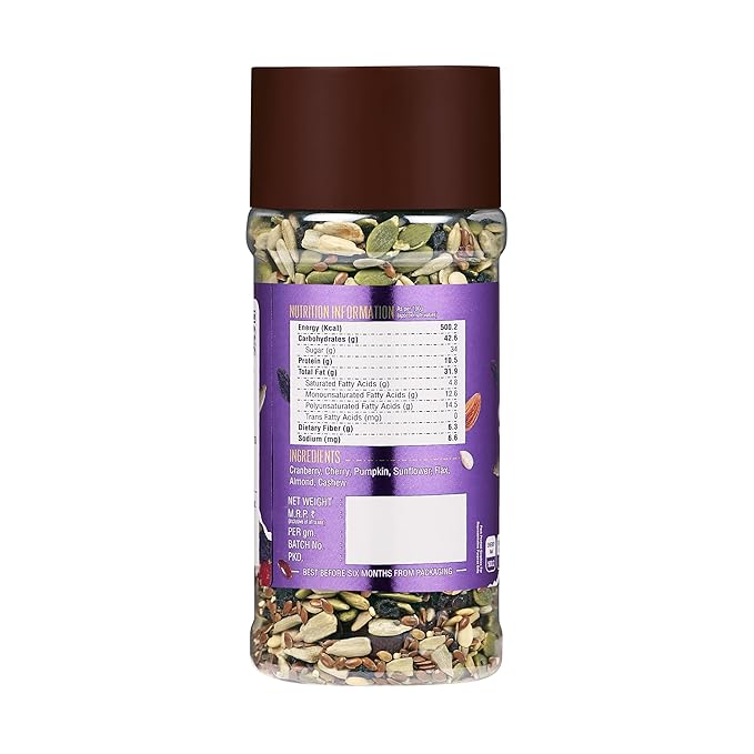 A premium trail mix featuring roasted almonds, cashews, pistachio kernels, and an array of seeds and berries—flax seeds, chia seeds, sunflower seeds, pumpkin seeds, quinoa seeds, whole cranberries, and black currants—carefully curated for balanced nutrition and flavor. This mix delivers antioxidants and vitamin E from nuts, omega-3 fatty acids and fiber from flax and chia seeds, protein and energy from seeds, and immune-supporting compounds from cranberries and currants. It’s designed to boost immunity, support digestion, and aid in weight management.