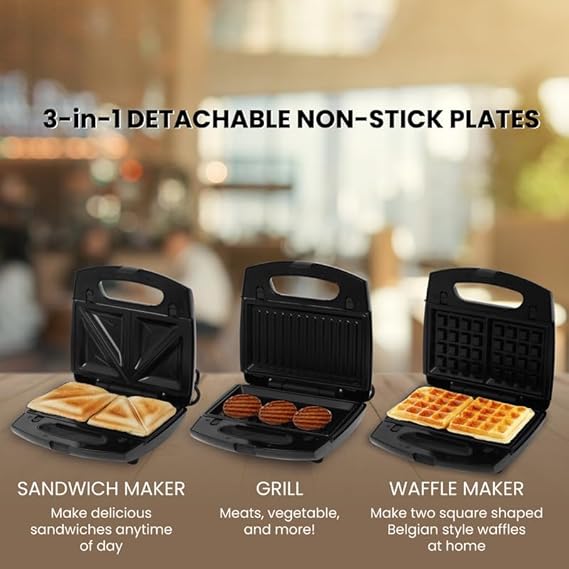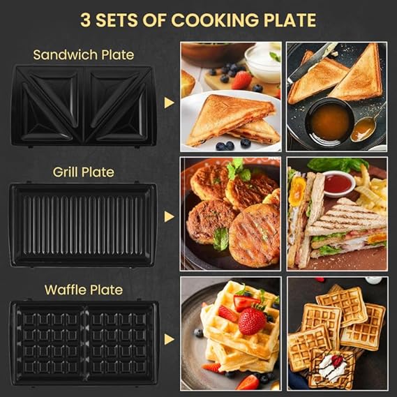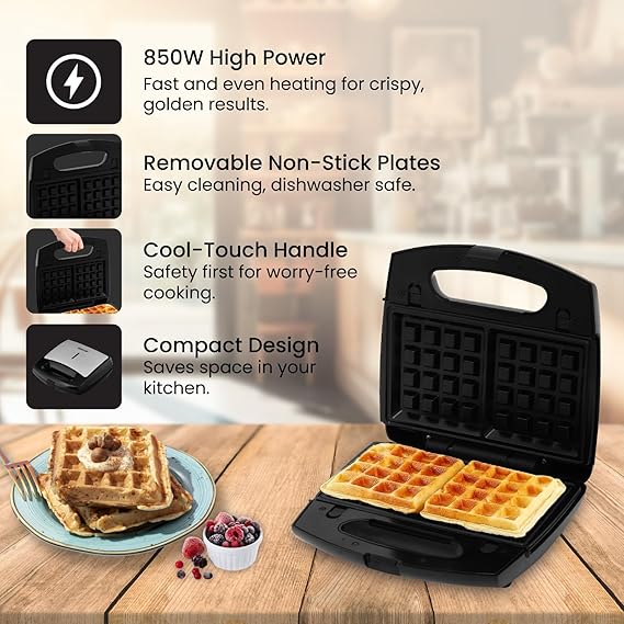 This product is intended for domestic use only. Always read and follow the user manual and safety instructions before use. Do not touch the heating plates or any metal parts during or immediately after use, as they may be hot. Ensure the appliance is unplugged when not in use, when cleaning, or when adjusting the sandwich. Keep out of reach of children to prevent burns or accidents. Do not immerse the toaster in water or other liquids. Wipe it clean with a damp cloth only. Do not use the toaster if the power cord or plug is damaged. In case of damage, contact an authorized service center. Do not use the appliance for anything other than its intended purpose. Ensure the toaster is placed on a flat, dry, and heat-resistant surface during use. Do not use the toaster with any non-approved accessories or add-ons. For safety, always allow the appliance to cool down before cleaning or storing it.