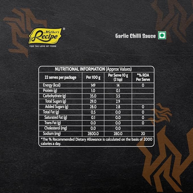 Mother's Garlic Chilli Sauce (220g) is a flavorful and zesty blend of garlic, red chilies, and spices, offering the perfect balance of heat and savory richness. This sauce adds a unique, aromatic kick to your meals, making it a versatile condiment for a wide range of dishes such as noodles, fried rice, snacks, or even grilled meats. The bold combination of garlic and chili provides an irresistible flavor profile, while the 220g bottle ensures you have enough to enhance your cooking on a regular basis. Ideal for those who love a spicy, garlicky twist to their food!