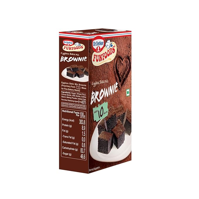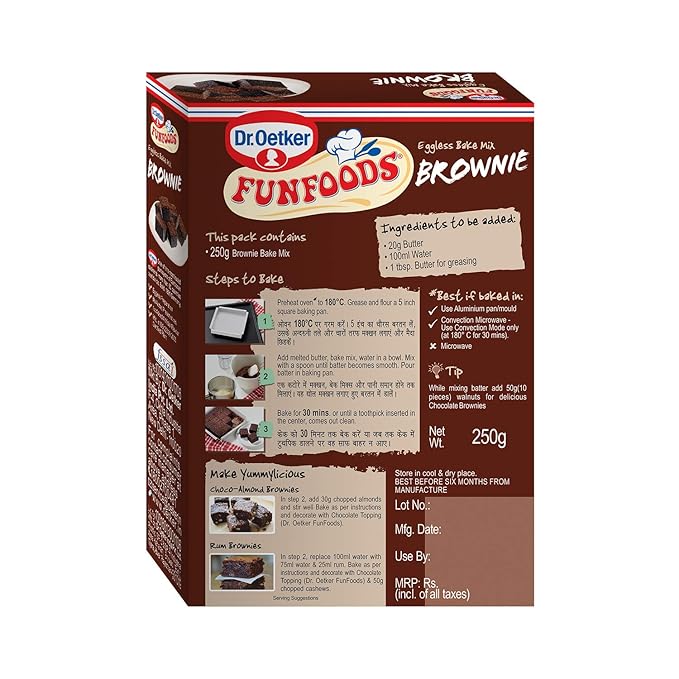 Dr. Oetker Brownie Mix (250g) is the perfect solution for baking rich, fudgy brownies with ease. This ready-to-use mix delivers a moist, chocolatey treat that is full of flavor and texture. Simply add a few ingredients like butter and eggs, and in no time, you'll have freshly baked brownies with a soft, gooey center and a deliciously crisp top. Whether you're baking for a special occasion, a family gathering, or just to satisfy your sweet tooth, Dr. Oetker Brownie Mix guarantees a crowd-pleasing dessert every time.