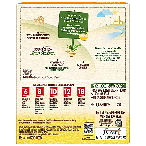 Nestlé Cerelac Wheat is a complementary food intended for infants over 6 months of age. Breastfeeding should continue for as long as possible. Consult your pediatrician before introducing any new food to your baby’s diet. Always follow the preparation instructions on the packaging. Store in a cool, dry place and use within the recommended timeframe after opening.